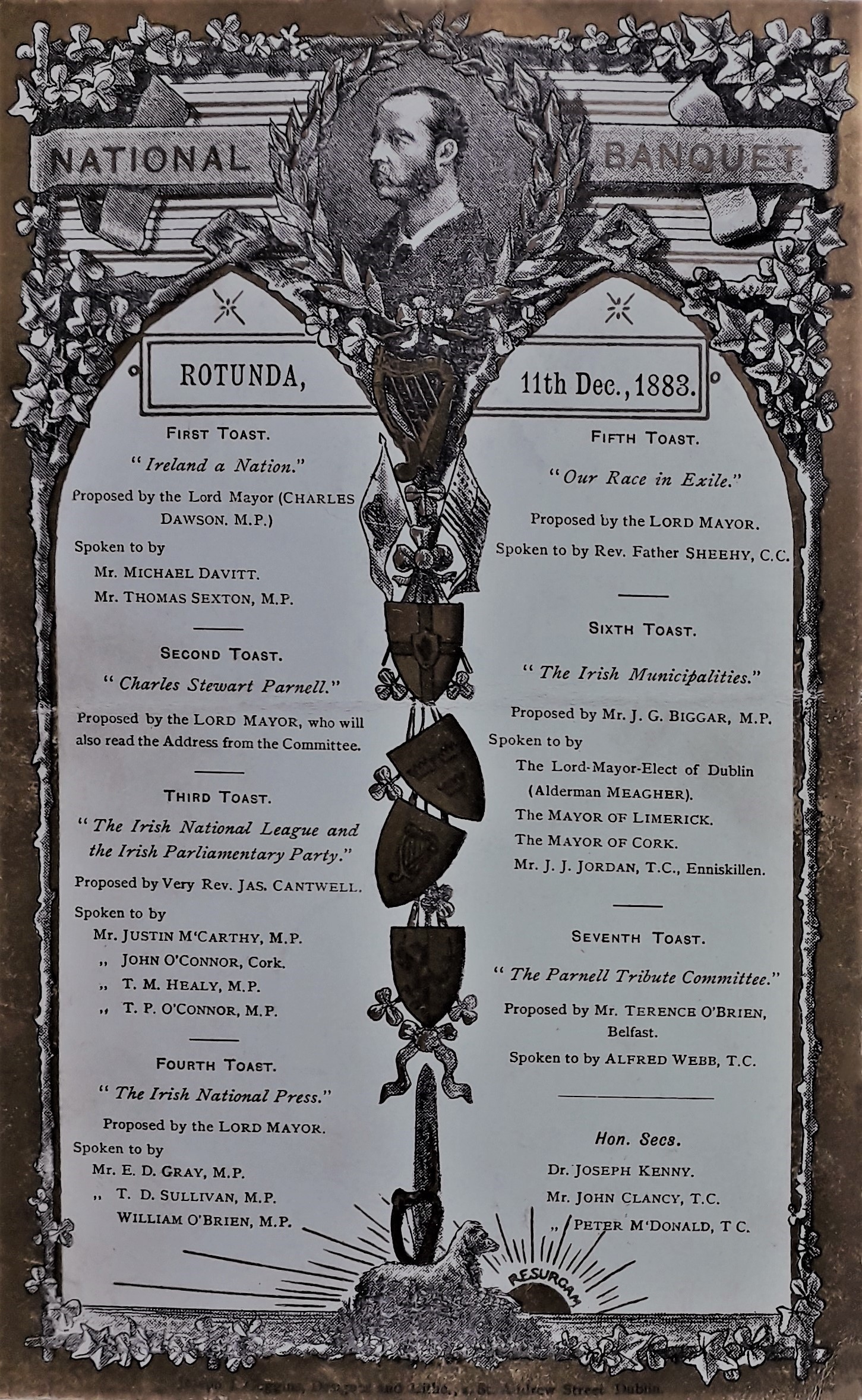 A toasting card for a nationalist banquet held in the Rotunda in Dublin on 11 December 1883. Includes patriotic toasts to Charles Stewart Parnell, the Irish Parliamentary Party, and the Irish National Press.