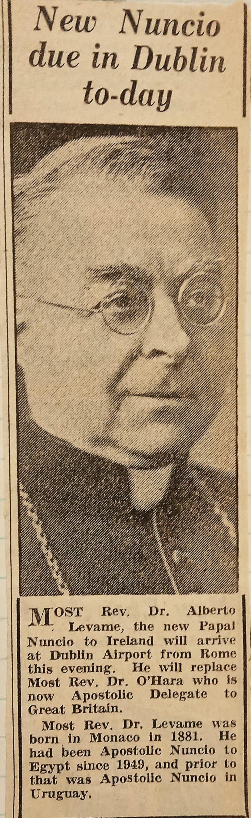 A clipping of an article referring the arrival in Dublin of Archbishop Albert Levame, the new Apostolic Nuncio to Ireland. The clipping is taken from the ‘Irish Press’ (8 August 1954).