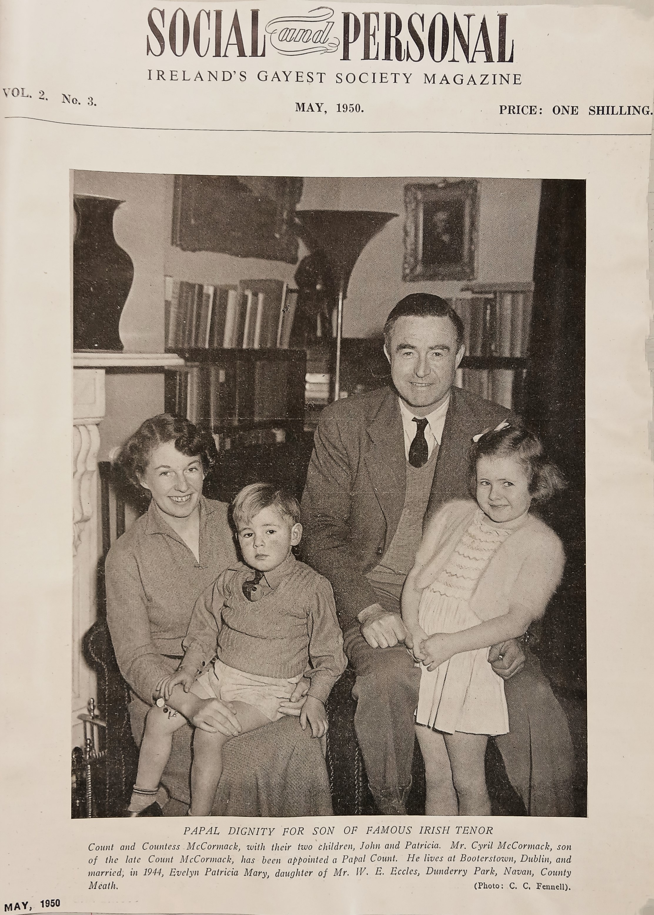 A clipping of a photograph of Cyril McCormack, the son of John McCormack, and his family. The caption notes that Cyril McCormack has recently been appointed a Papal Count. The clipping is taken from ‘Social and Personal’, Vol. 2, No. 3 (May 1950).