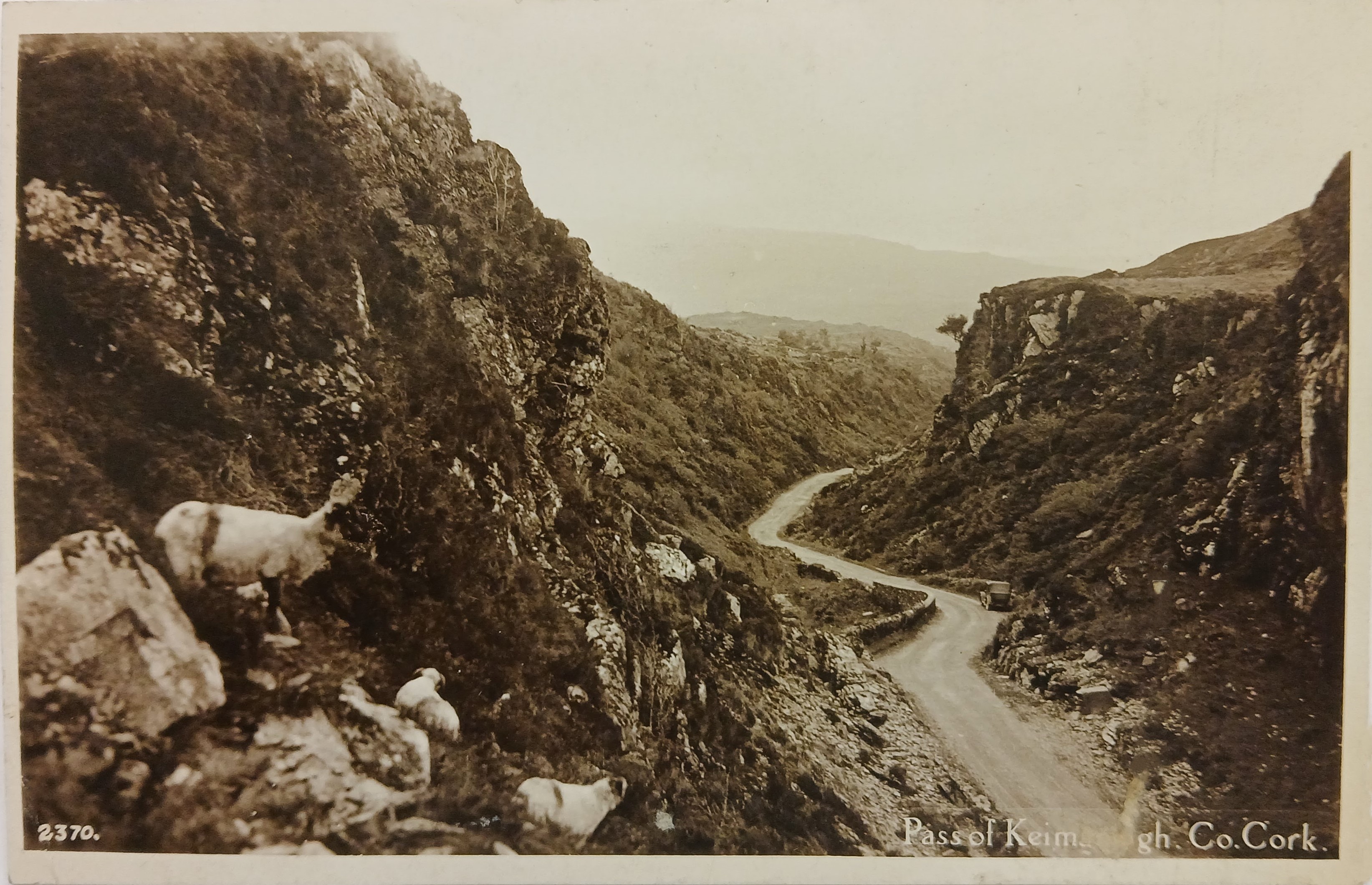 A postcard image of the Pass of Keimaneigh (in Irish 'Céim an Fhia') in the Shehy Mountains in County Cork. Printed annotation on the reverse reads 'Real Photo by Mason, Dublin'.