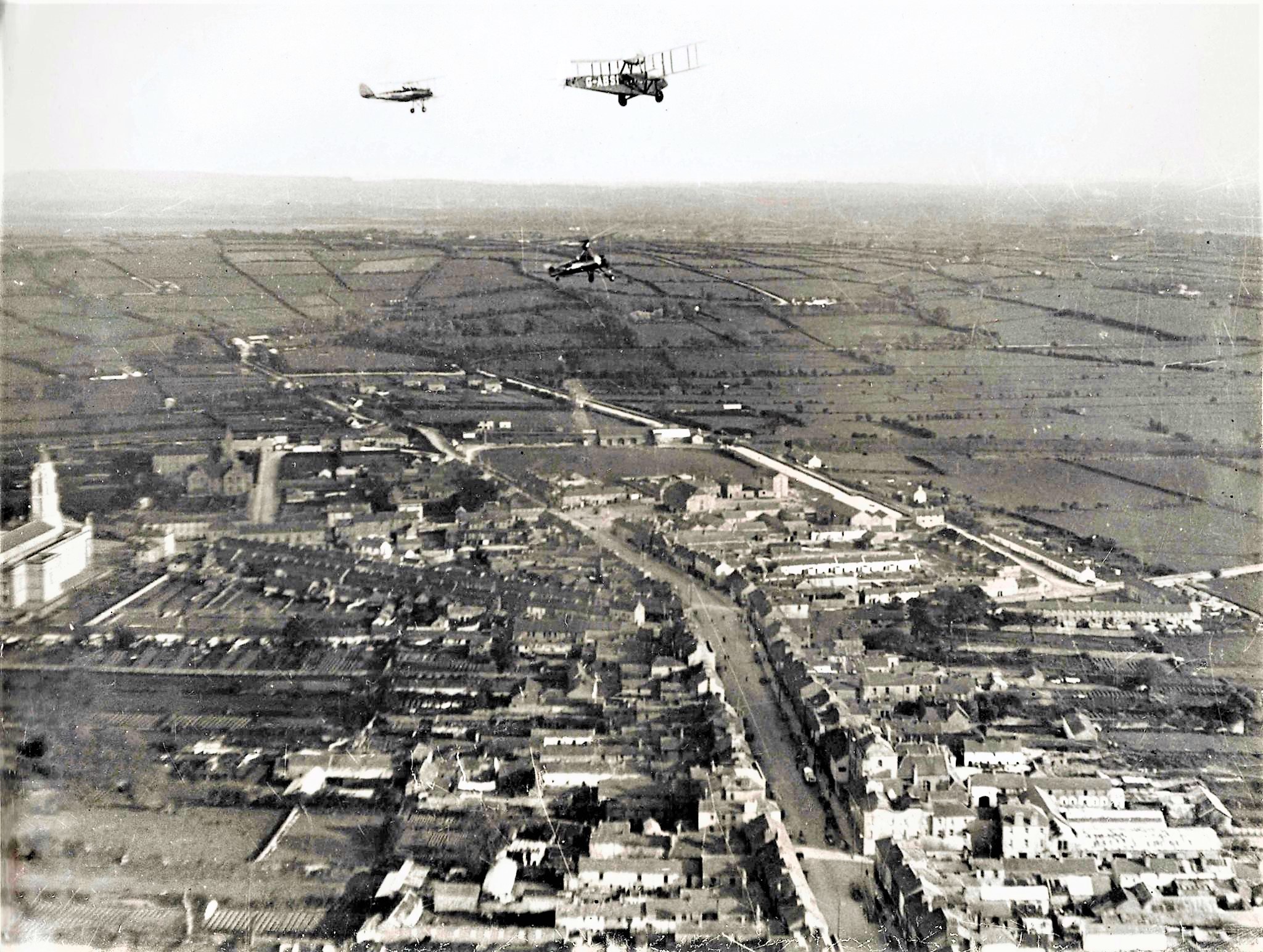 A view of biplanes (and a autogyro) over Longford Town in about 1935. The larger plane is apparently an Airspeed Ferry, a ten-seat passenger biplane built in the early 1930s. The photograph is related to an aviation display organised by Alan Cobham (1894-1973). Cobham organised displays of various aircraft, ranging from single-seaters to modern airliners, with many skilled pilots. He toured both Britain and Ireland, calling at hundreds of sites, some of them regular airfields and some just fields cleared for the occasion. Generally known as ‘Cobham's Flying Circus’, it was hugely popular, giving thousands of people their first experience of flying. These displays continued until about 1935.