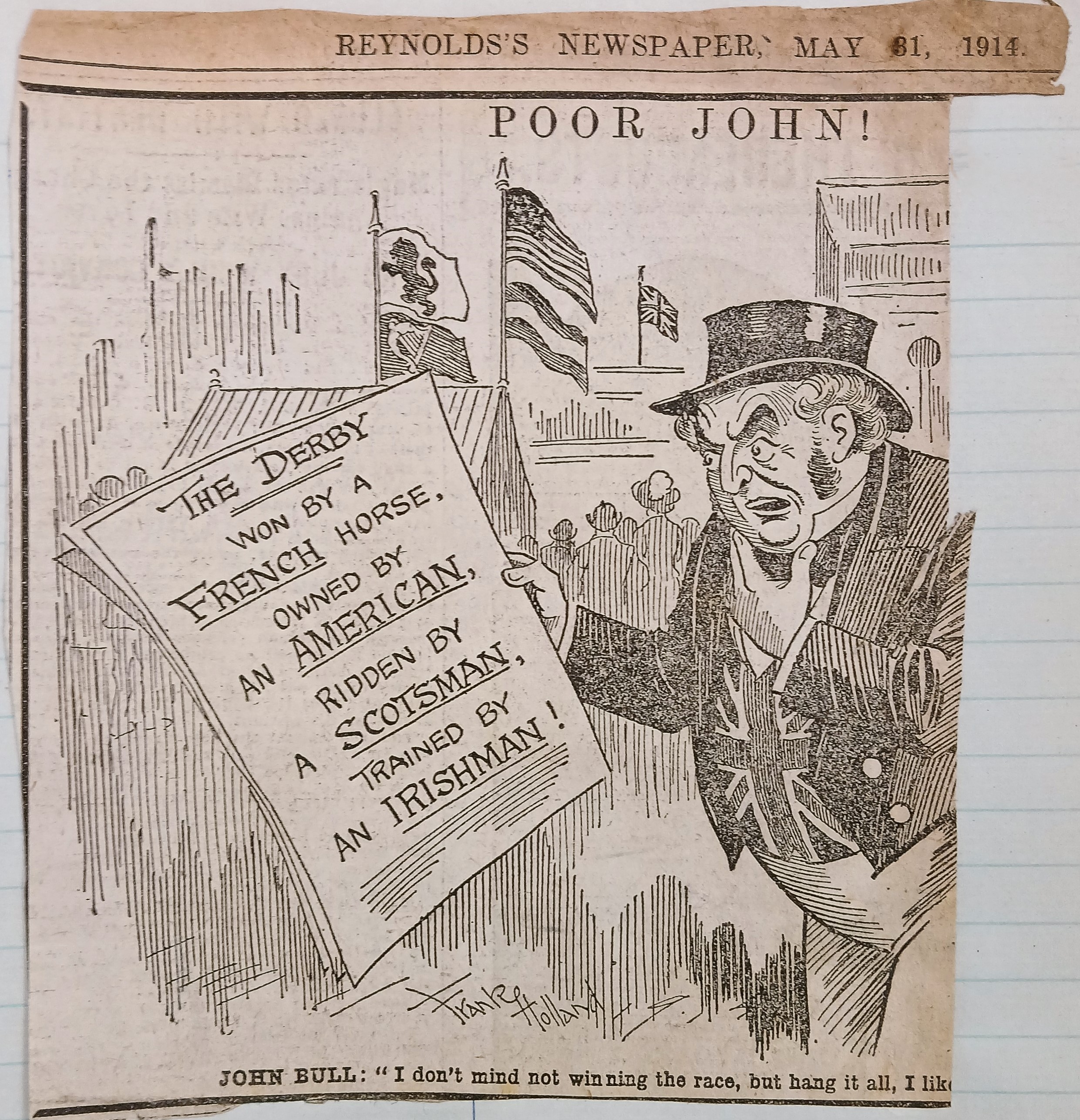 A clipping of a cartoon titled ‘Poor John!’ The cartoon is by Frank Holland (1871-1945) and was published in the ‘Reynolds’s Newspaper’ (31 May 1914).