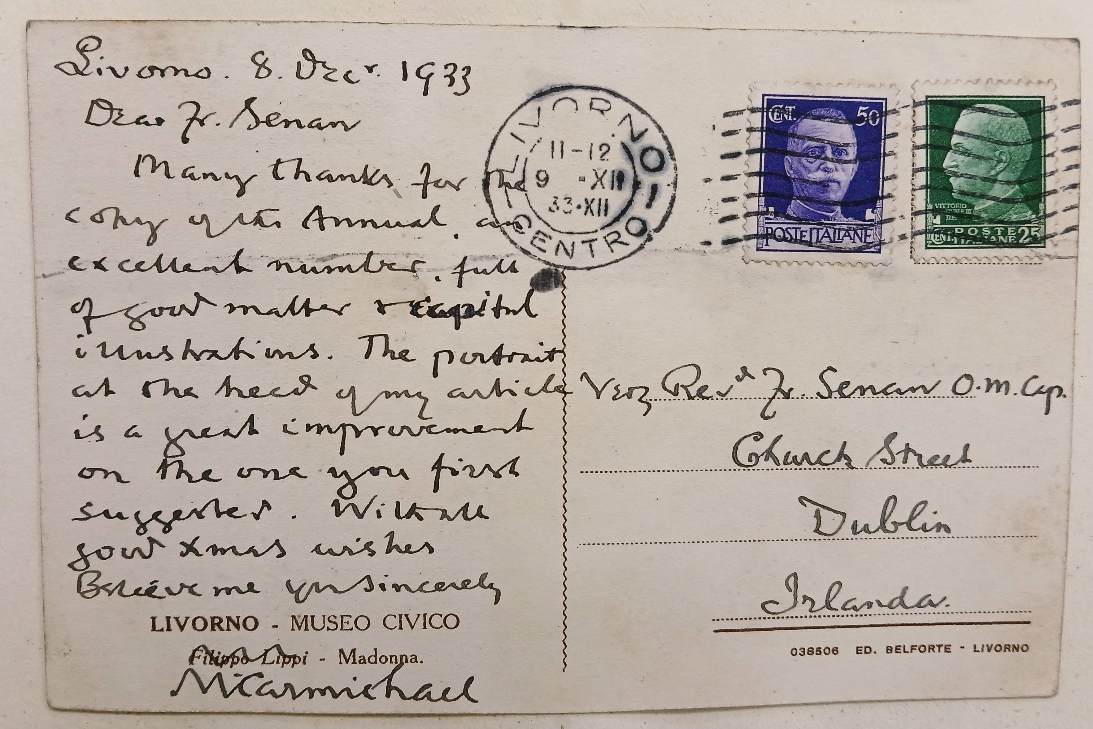 A postcard from Montgomery Carmichael, Livorno, Italy, to Fr. Senan Moynihan OFM Cap. thanking him for a copy of the 1934 edition of ‘The Capuchin Annual’ and briefly referring to his article therein.
