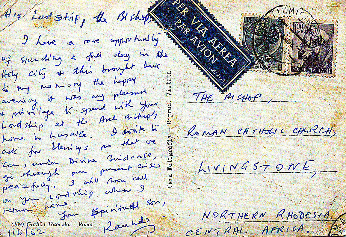 Photographic print of a postcard from Kenneth Kaunda (later President of Zambia) to Bishop Timothy Phelim O’Shea. The postcard was written during Kaunda’s visit to Rome and asks for ‘divine guidance … [during] our present crisis’.