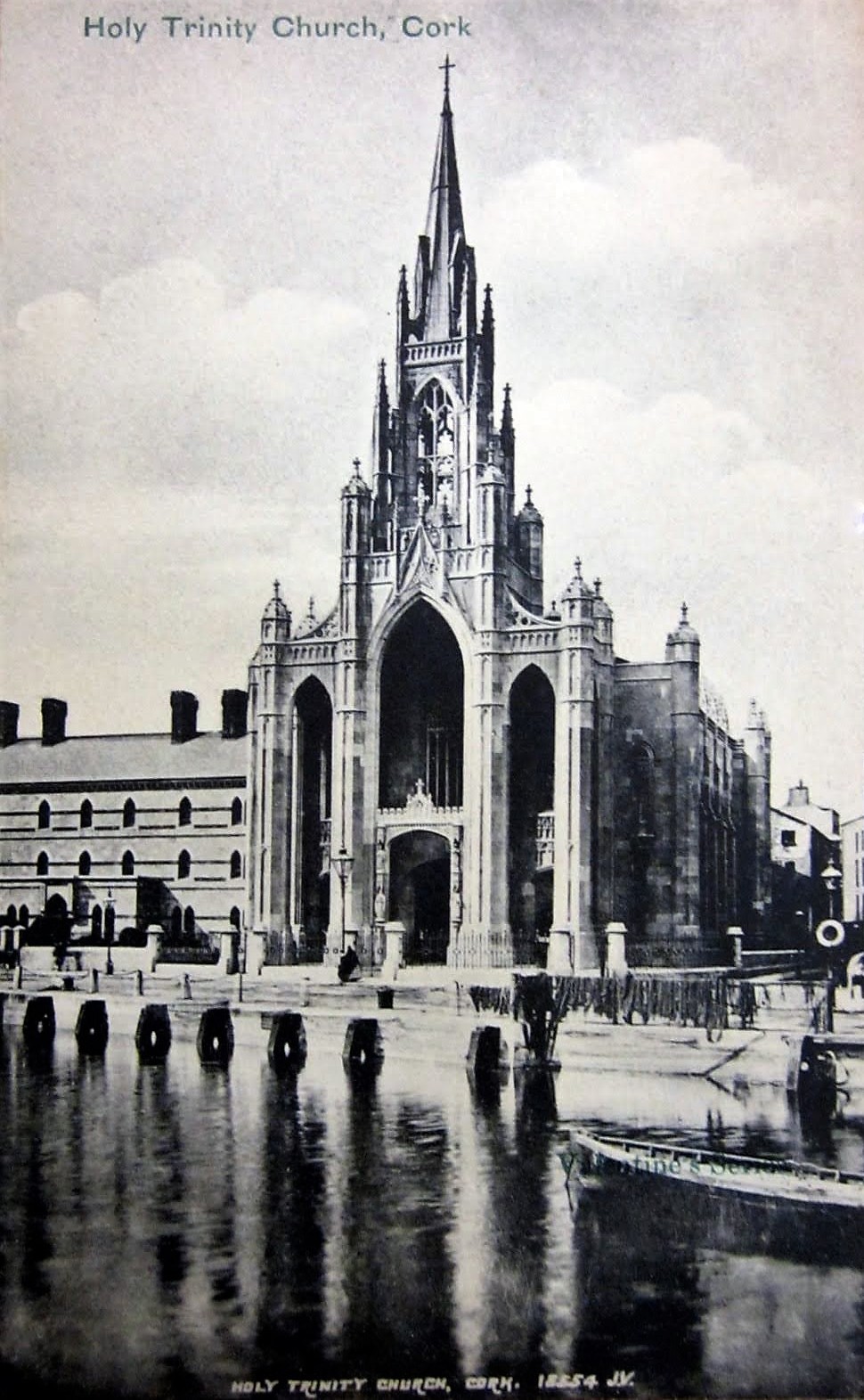A postcard print of the exterior of Holy Trinity Church and the adjoining Capuchin Friary on Father Mathew Quay in Cork. The image forms part of the Valentine series of postcards and is titled 'Holy Trinity Church, Cork / 18554 JV'.