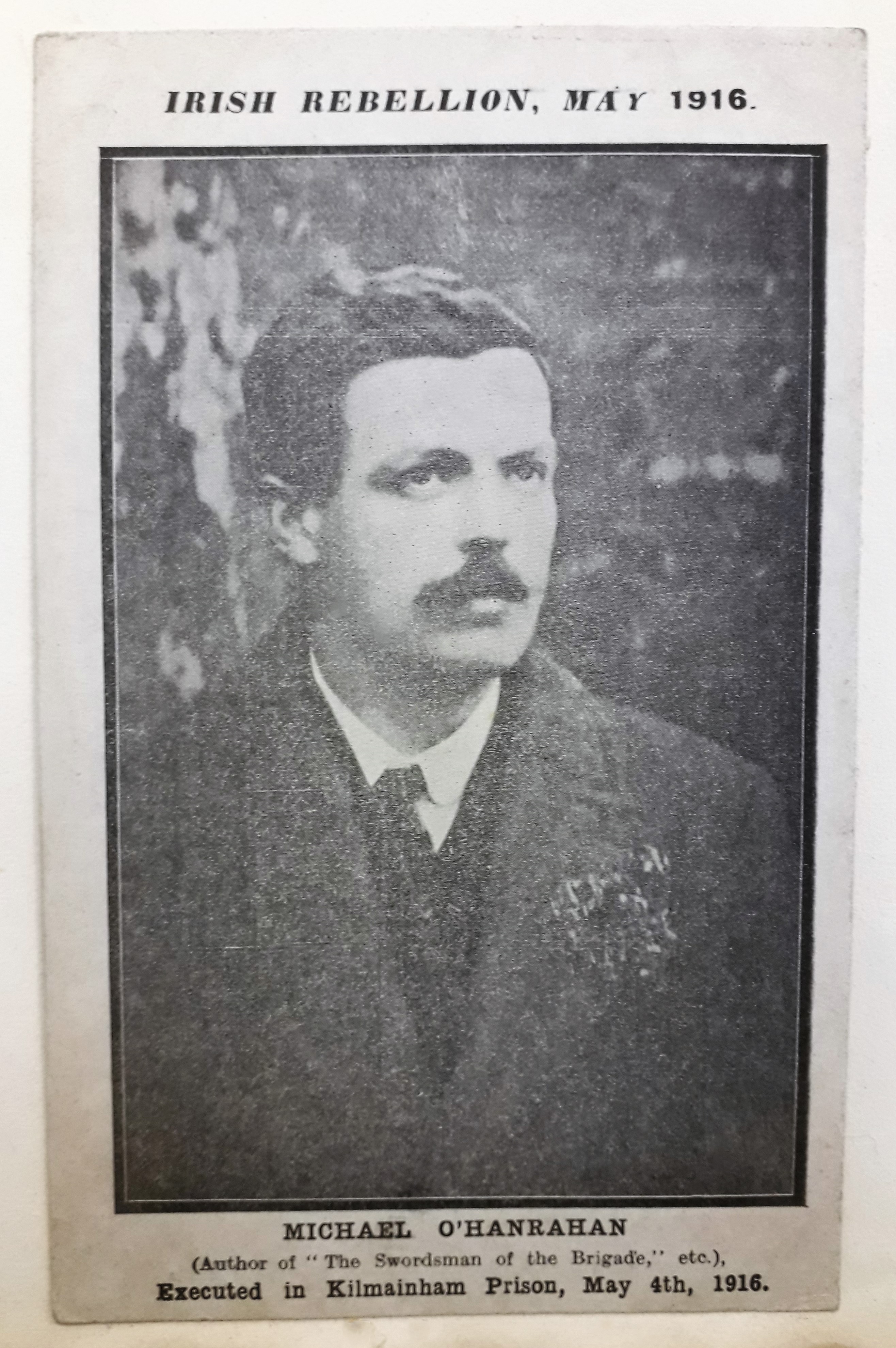 A postcard print of Michael O’Hanrahan. The caption reads ‘Author of the “The Swordsmen of the Brigade” etc / Executed in Kilmainham Prison, May 4th 1916’.