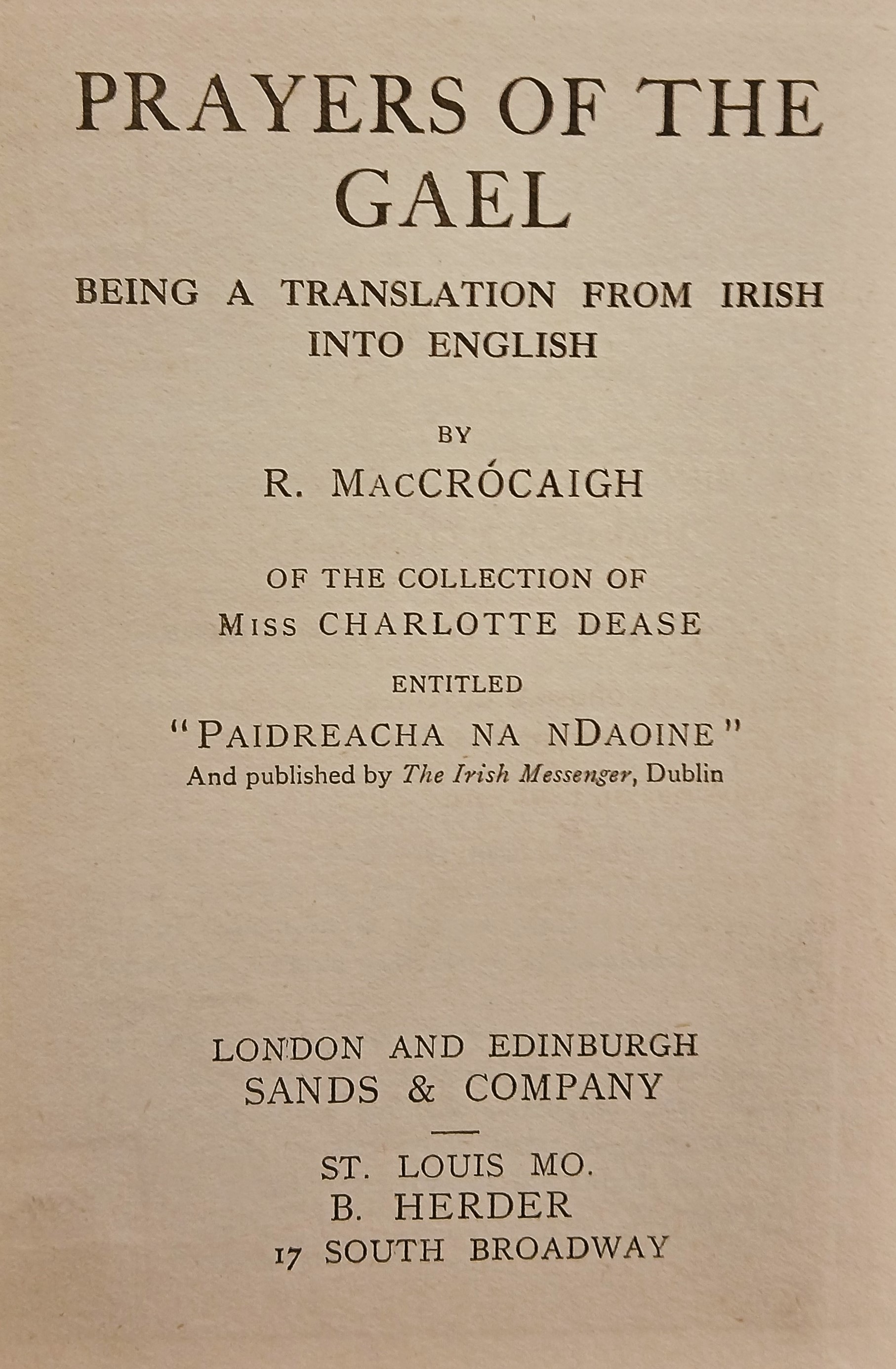A copy of ‘Prayers of the Gael / being a translation from Irish into English / by R. MacCrócaigh of the collection of Miss Charlotte Dease entitled “Paidreacha na nDaoine” and published by the “Irish Messenger”, Dublin’ (London and Edinburgh: Sands & Company, 1915). Bookplate reads ‘Ex Libris Joseph W. Gannon’.