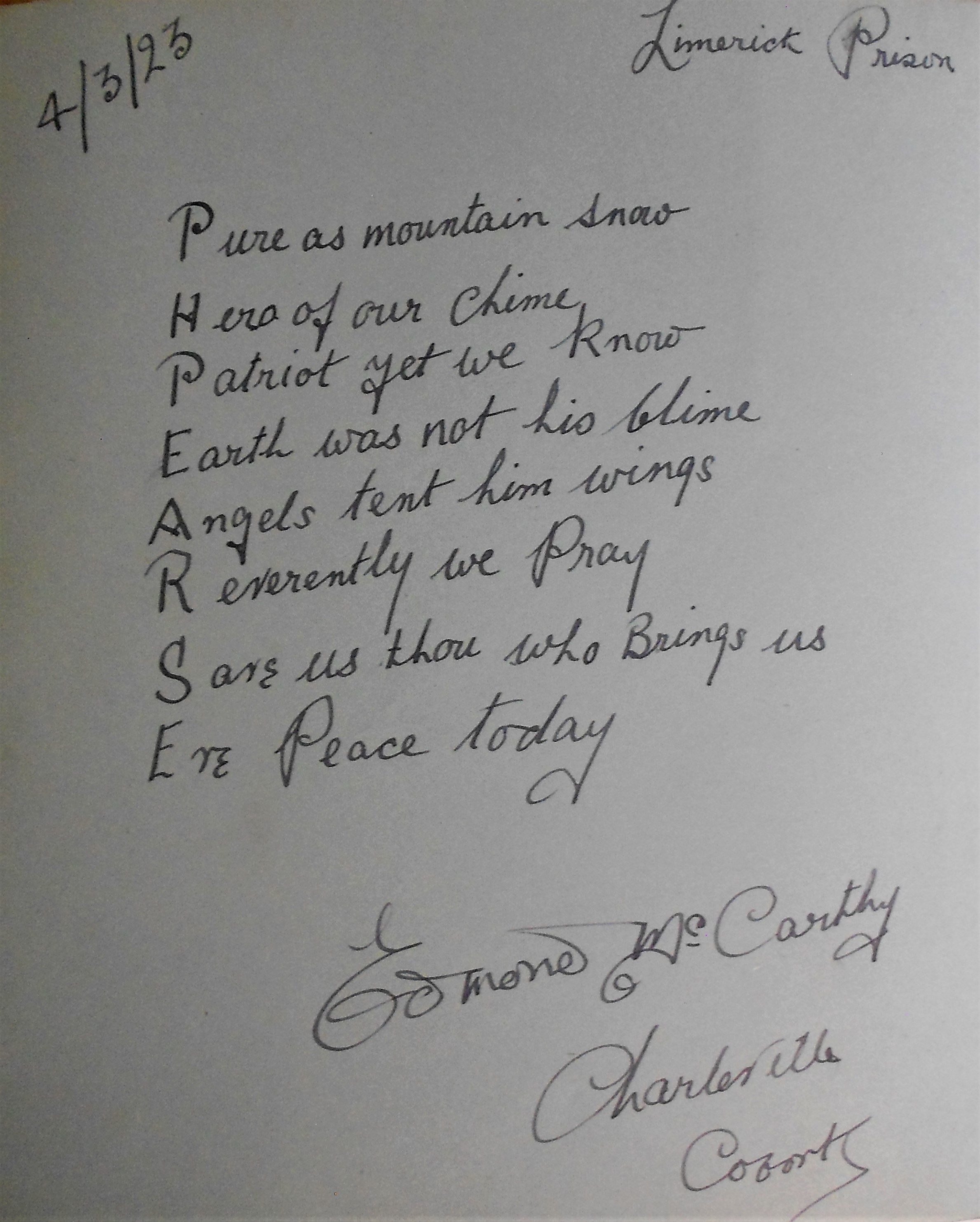 Prisoner (Edmond McCarthy) autograph text at Limerick Jail dated 4 March 1923.