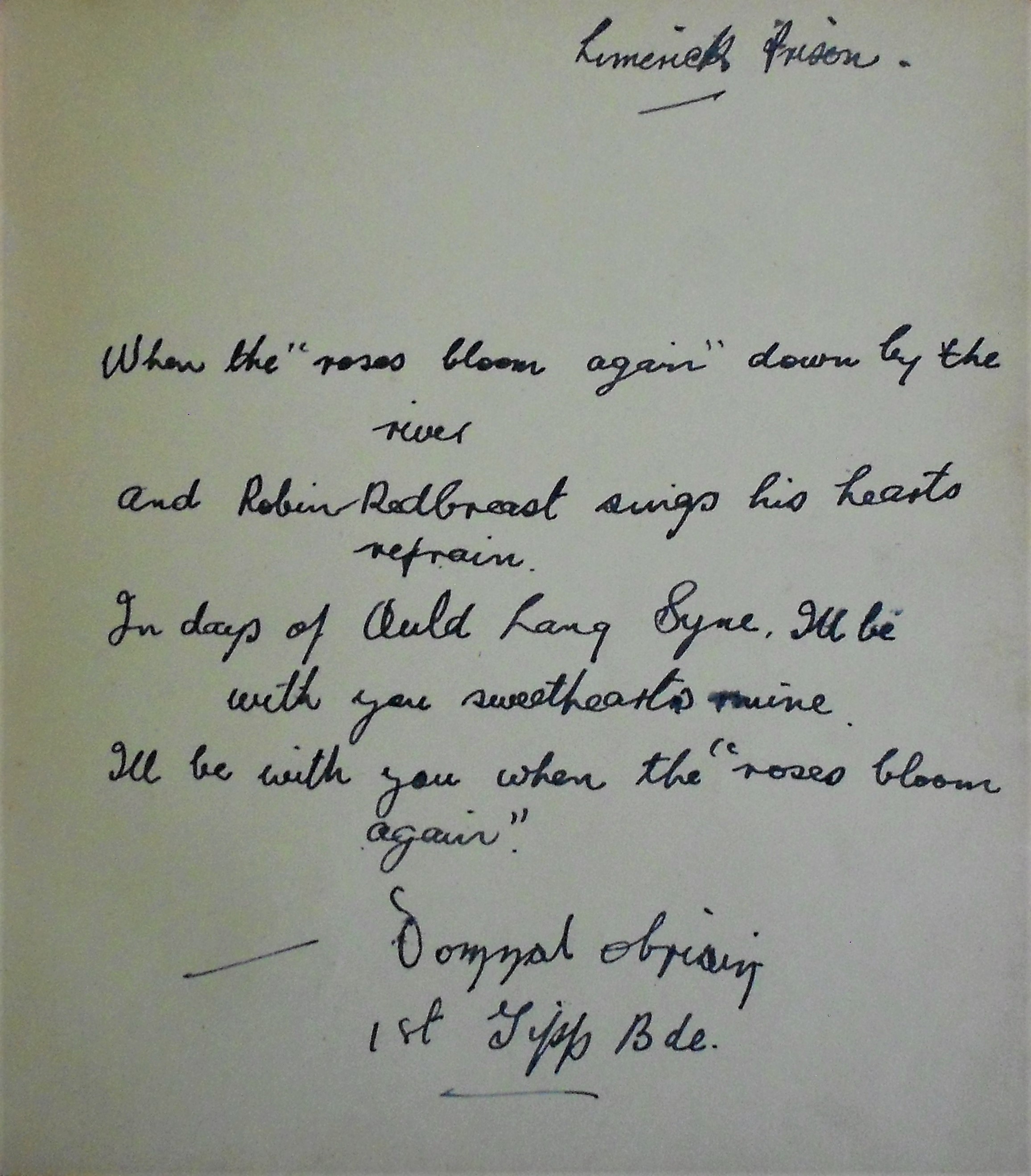 Prisoner (Domhnall Ó Briain) autograph text at Limerick Jail.