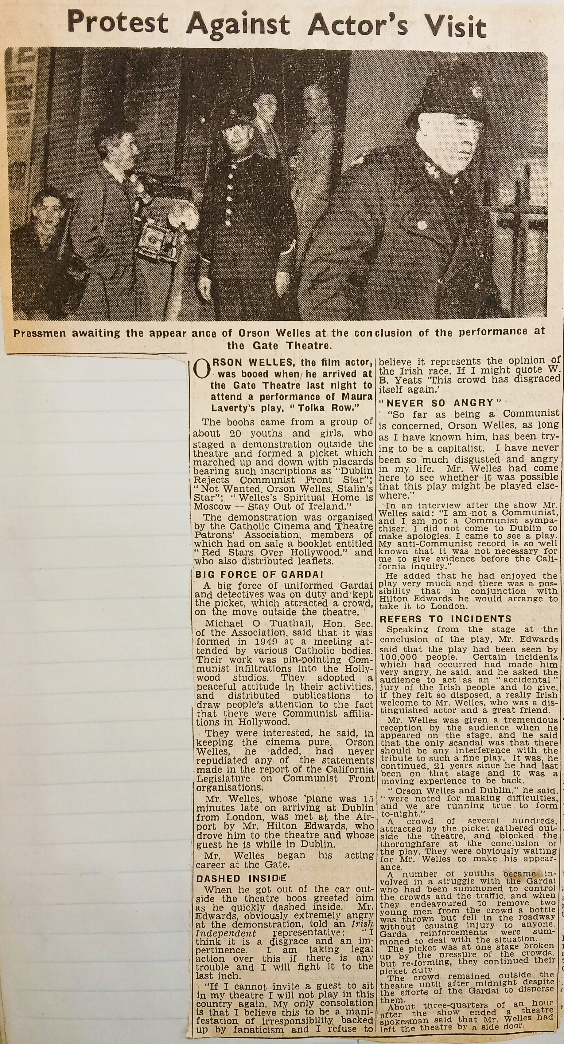 A clipping of an article reporting on a protest during a performance of Maura Laverty’s play ‘Tolka Row’ at the Gate Theatre in Dublin which Orson Wells attended. The protestors carried placards reading ‘Dublin rejects Communist Front Star’. The clipping is taken from the ‘Irish Independent’ (19 December 1951).