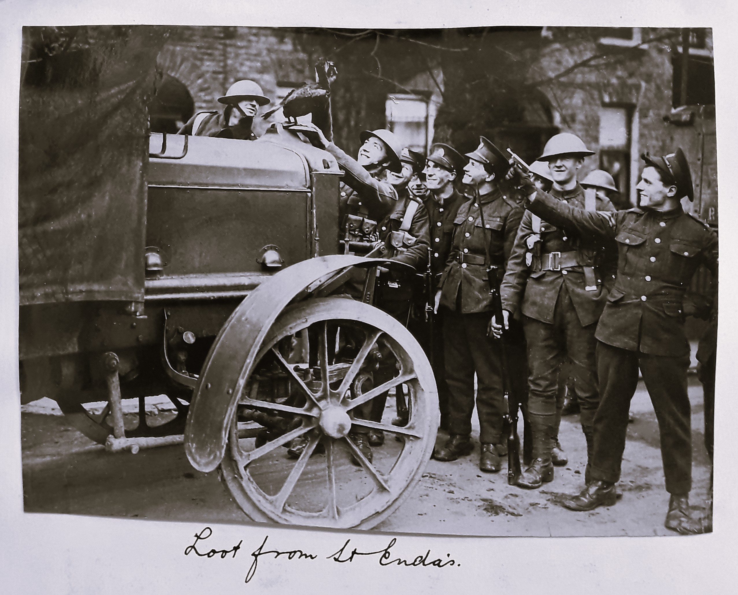 A photographic print of British army personnel with goods seized from St. Enda’s College (the school founded in 1908 by Patrick Pearse) in Dublin. The manuscript caption reads ‘Loot from St. Enda’s’.