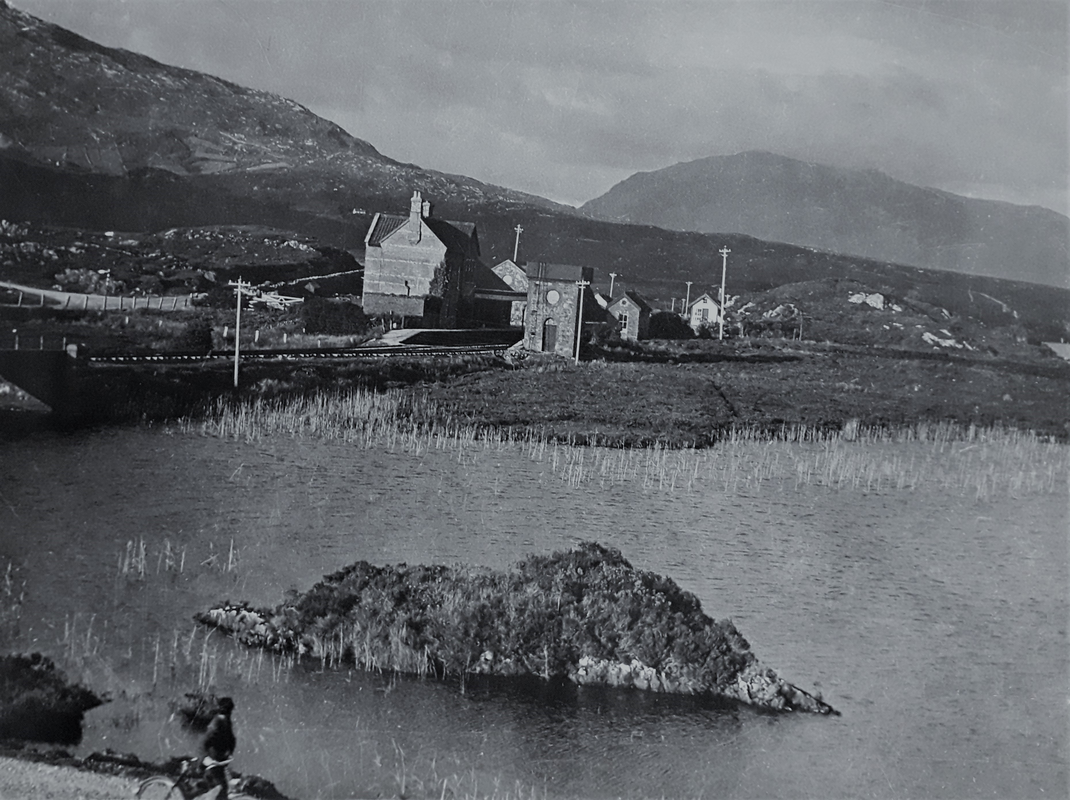 A view of the railway station in the small village of Recess (in Irish ‘Sraith Saileach’) in County Galway. The station is located on the northwest corner of Glendollagh Lough. It was one of several stations that ran through central Connemara on the Galway to Clifden line of the Midland Great Western Railway which opened in 1895.