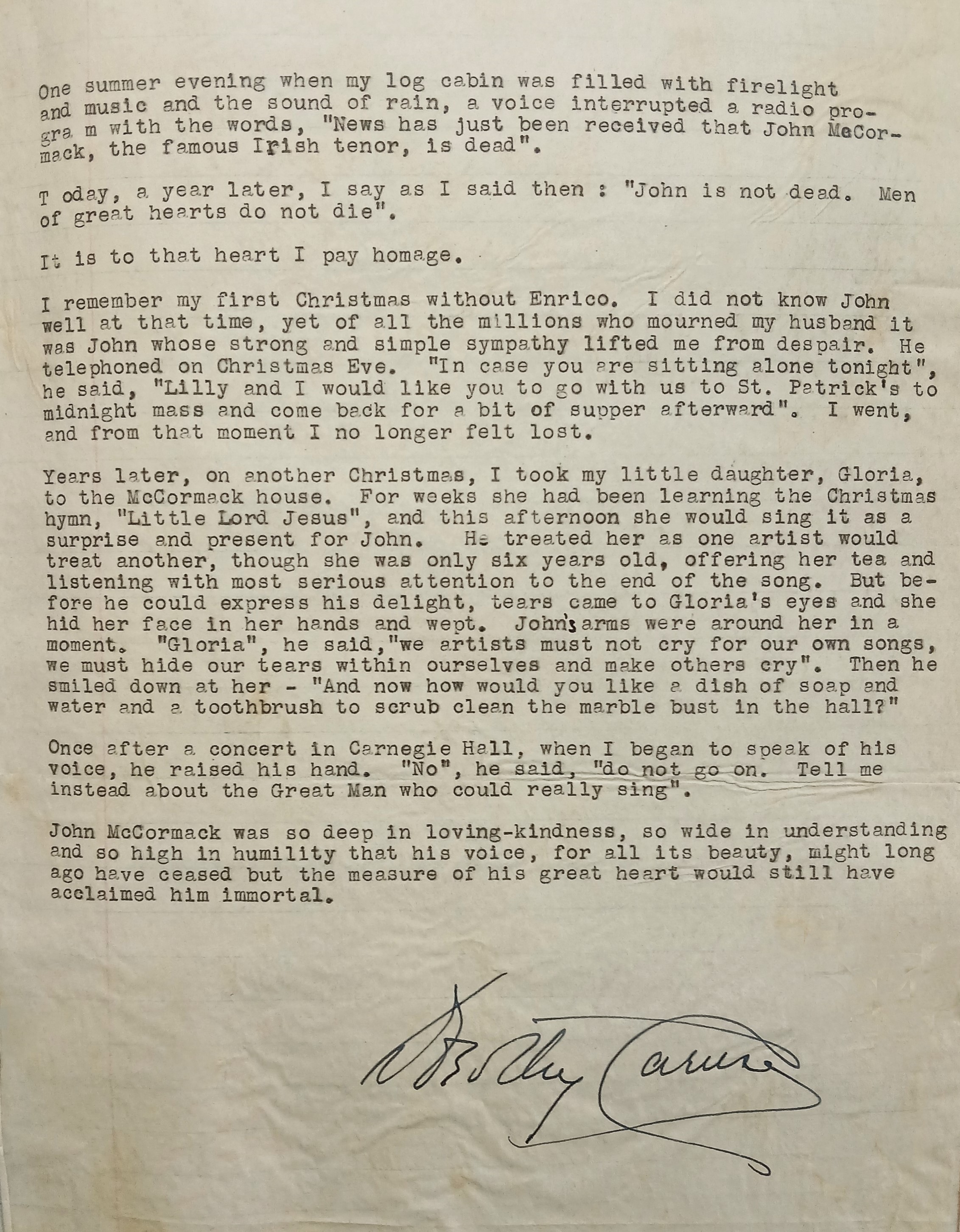 A short article with personal recollections and memories of John McCormack by Dorothy Caruso, the widow of the Italian operatic tenor Enrico Caruso. Dorothy Caruso submitted the short piece for publication in ‘The Capuchin Annual’.