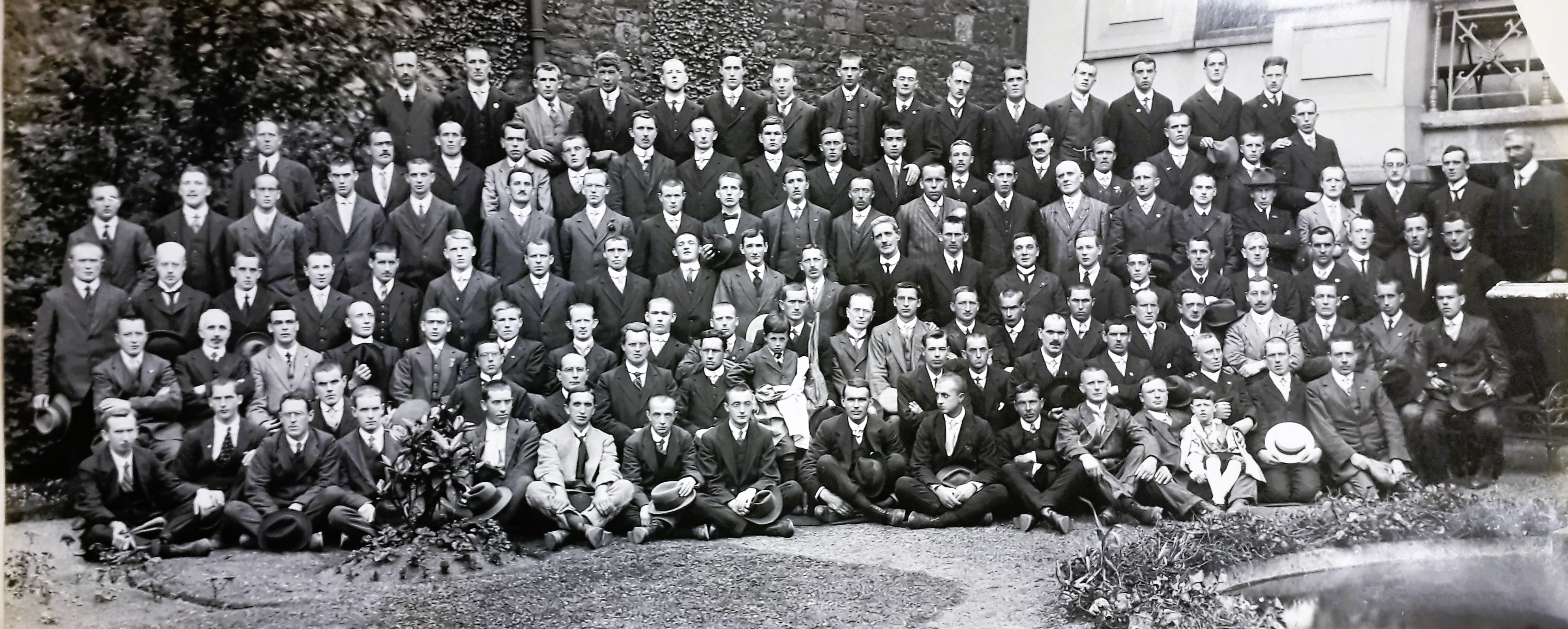 A photograph of a large group of former Irish republican prisoners. A manuscript annotation on the reverse of the print reads ‘Released Prisoner Group’. The group includes Éamon de Valera, Eoin MacNeill, and W.T. Cosgrave. The photograph was likely taken at the Mansion House in Dublin. The image is credited to Keogh Brothers Studio.