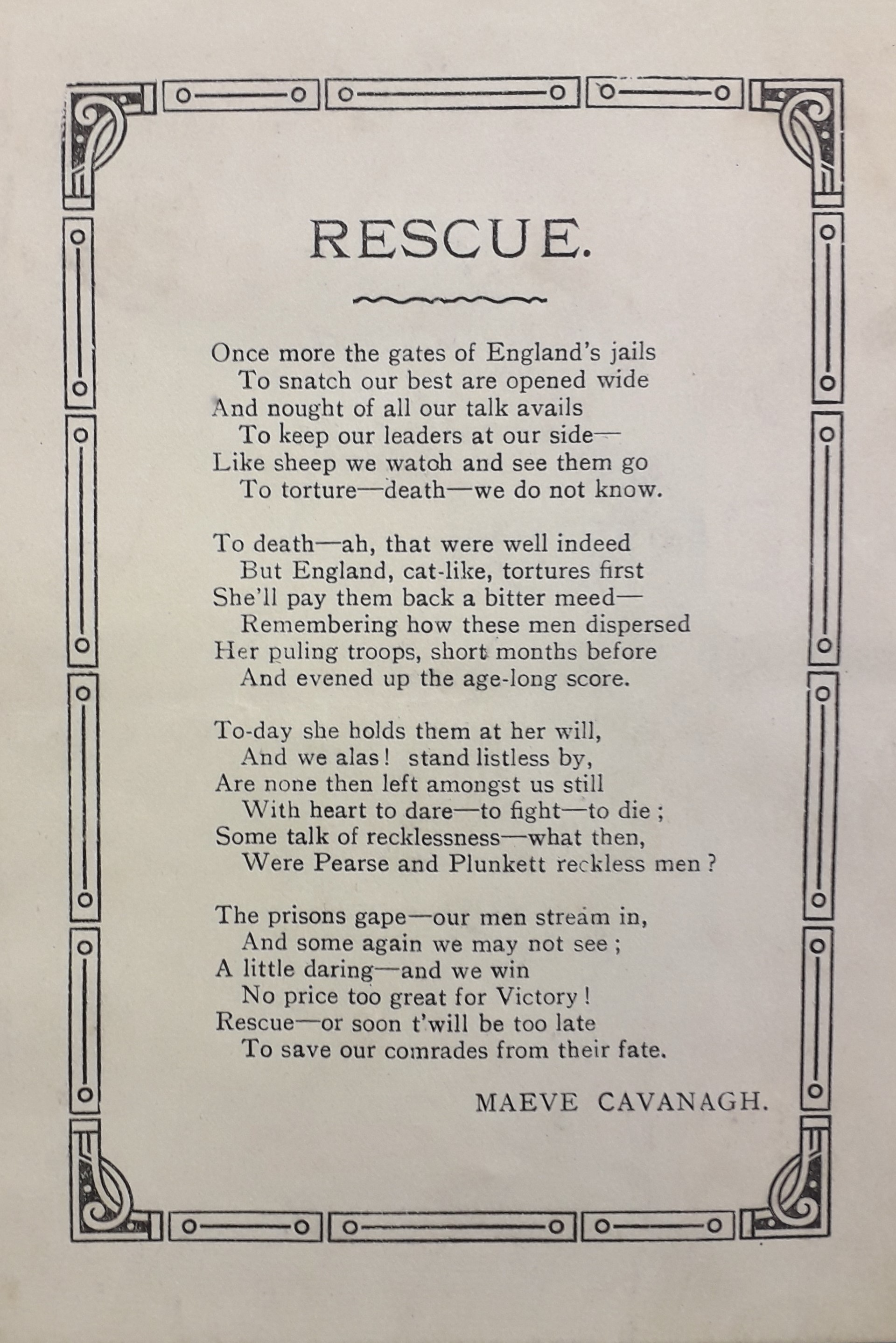 A flier with the text of a poem by Maeve Cavanagh titled ‘Rescue’ referring to the imprisonment of Irish republicans.