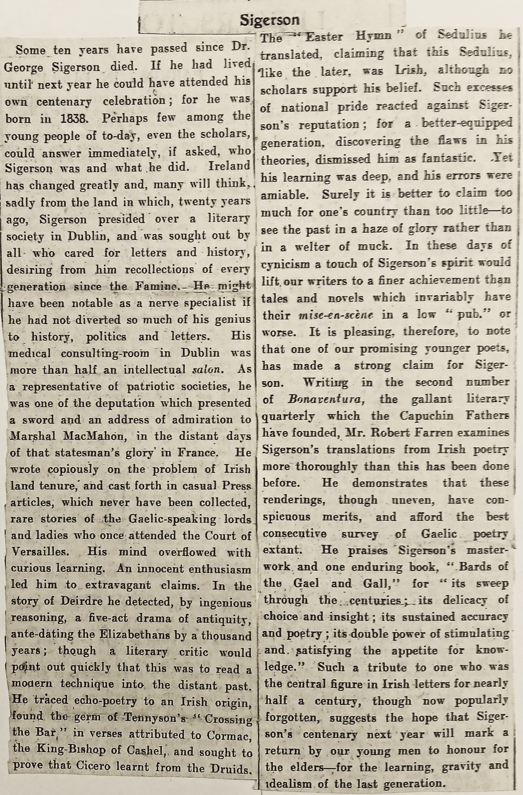 A clipping of a review citing Robert Farren’s article on George Sigerson published in the second issue of ‘Bonaventura’. The article was published in the ‘Irish Times’ (27 August 1937).