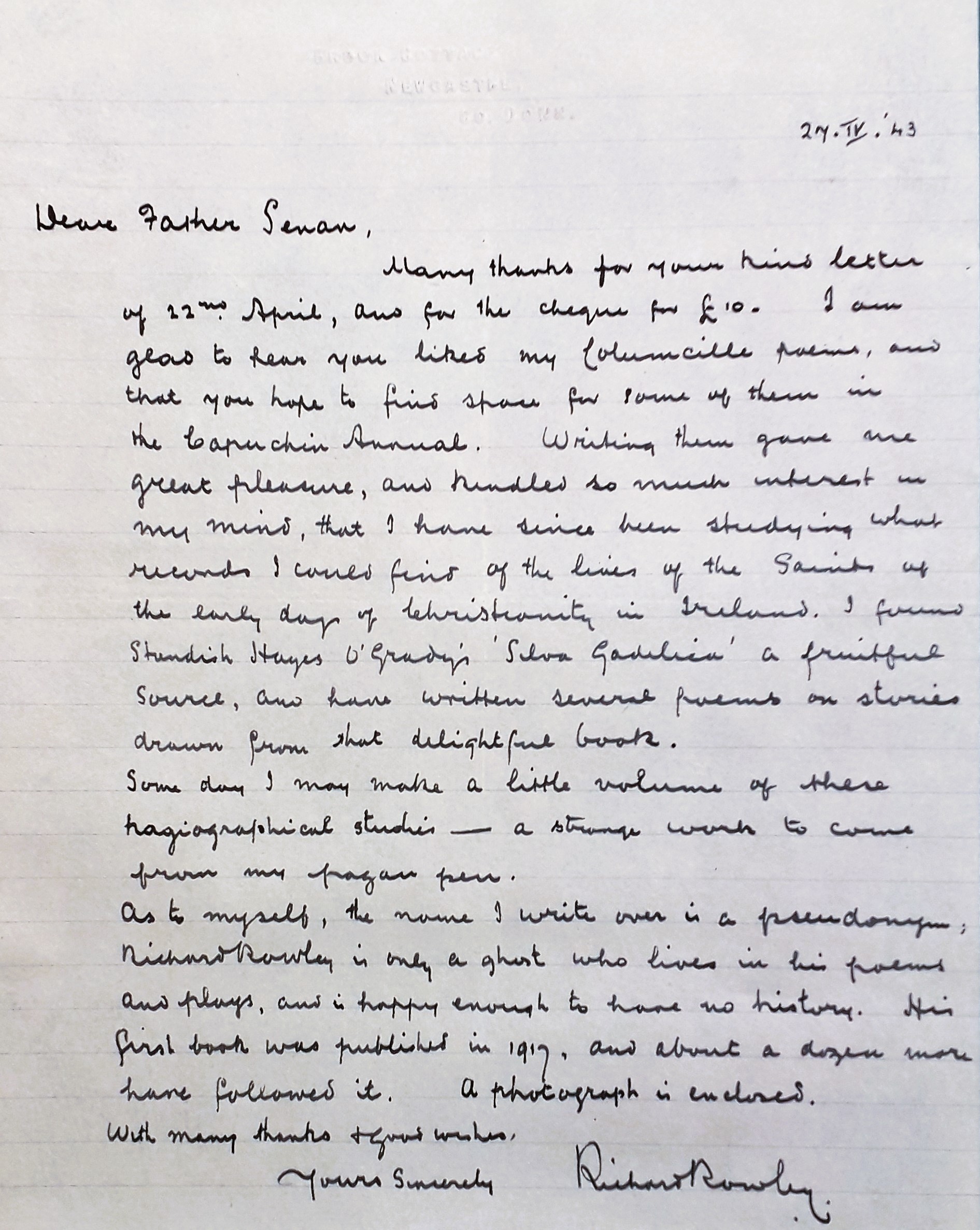 A letter from Richard Valentine Williams (‘Richard Rowley’) to Fr. Senan Moynihan OFM Cap. referring to the inclusion of his Columcille poems in ‘The Capuchin Annual’ and supplying some brief biographical information. He writes ‘the name I write over is a pseudonym, Richard Rowley is only a ghost who lives in his poems and plays, and his happy enough to have no history’.