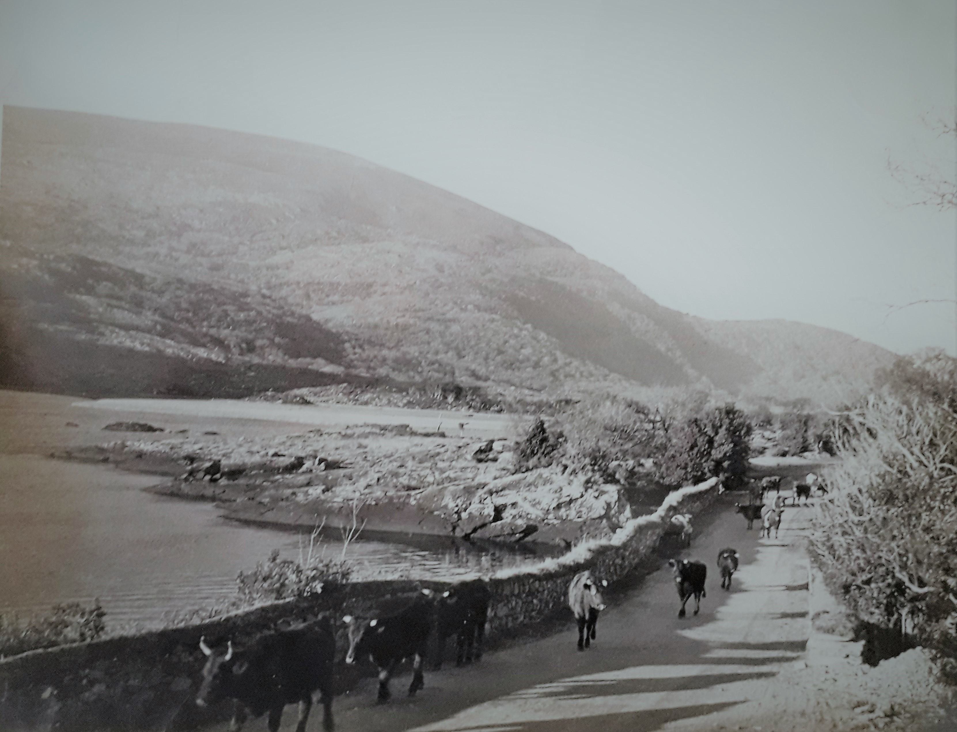 A view of cattle on a rural road in County Kerry. An annotation on the reverse of the print reads 'Kerry / On the Road to Kenmare / near Eagle's Nest'. Eagle's Nest is a mountain located in Killarney National Park.