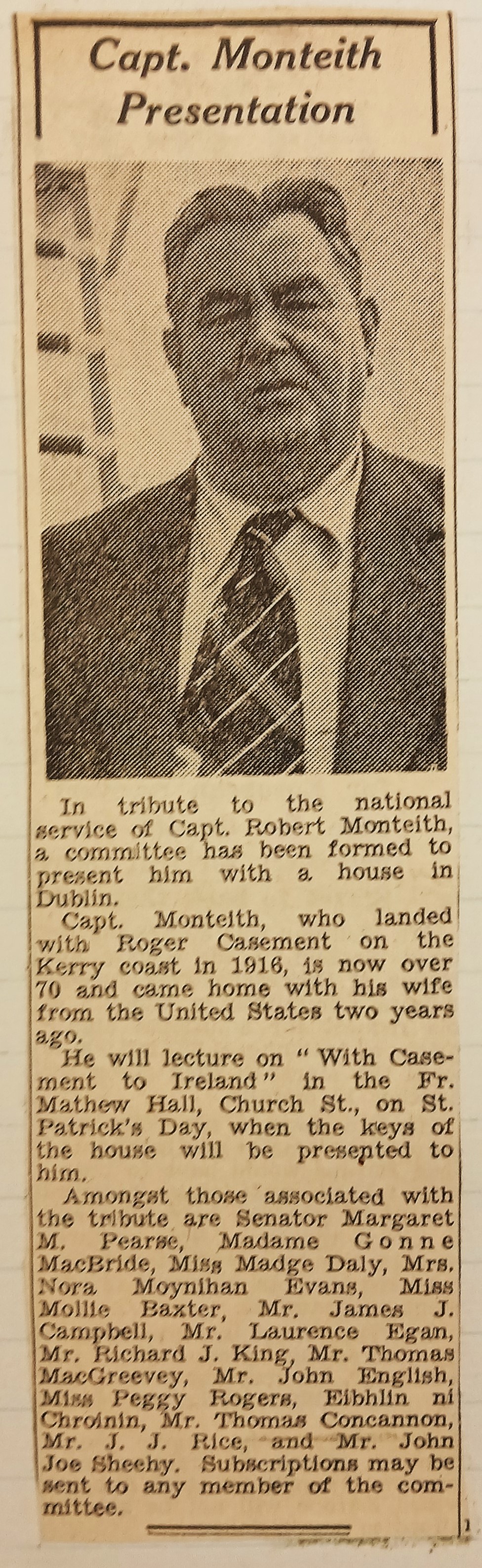 A clipping of an article referring to an event in Father Mathew Hall in Dublin at which a presentation will be made to Robert Monteith of the keys to a house in Dublin. The event will take place on St. Patrick’s Day. The article is taken from the ‘Irish Press’ (9 Feb. 1949).