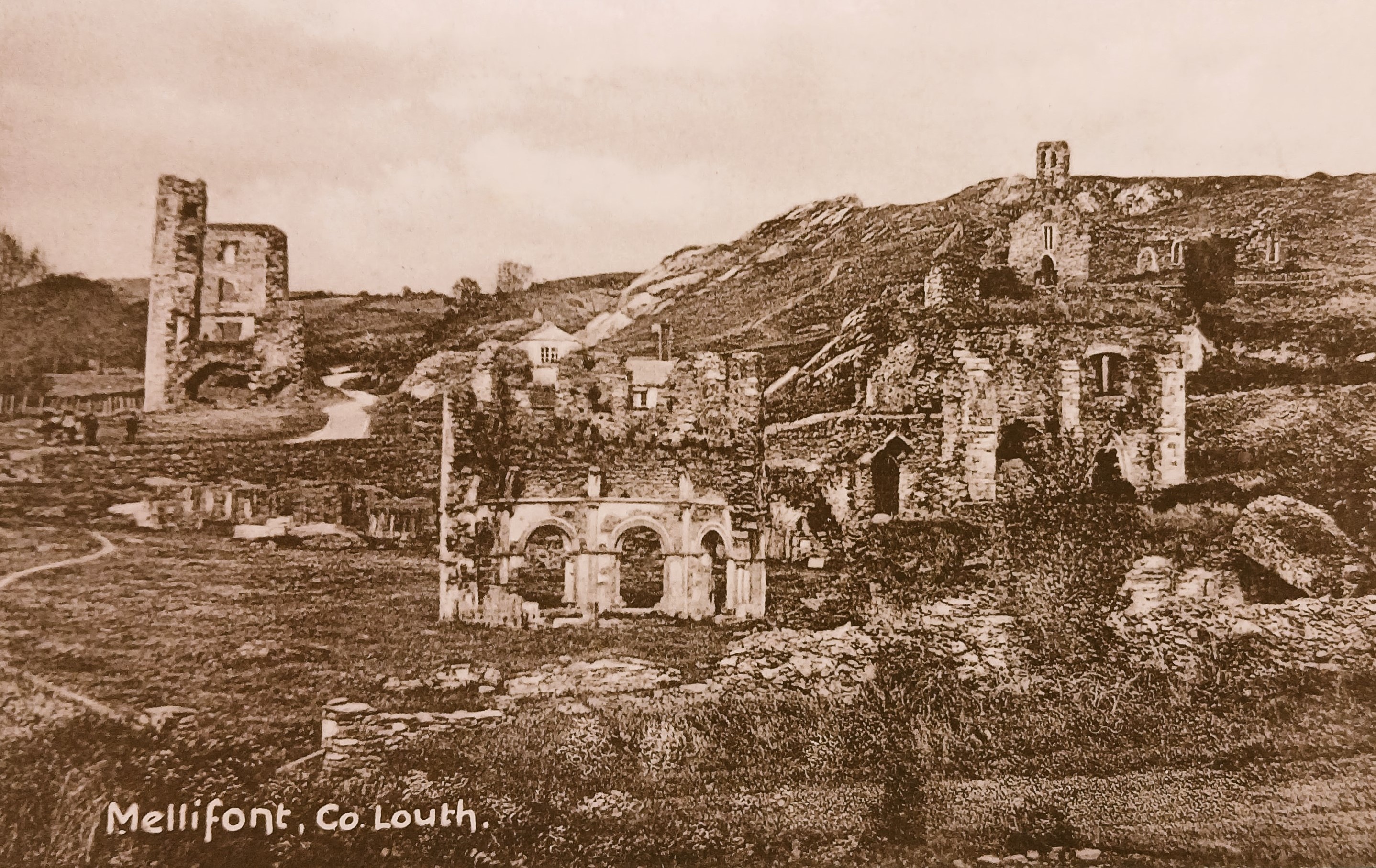 A postcard print of the ruins of the ruined Mellifont (Cistercian) Abbey in County Louth.