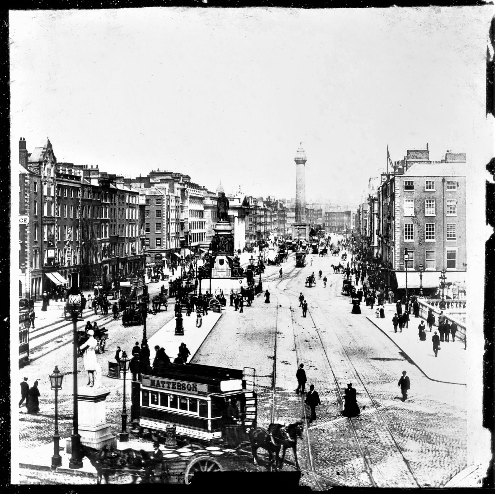 A view of Sackville (later O’Connell) Street looking towards the O’Connell monument in about 1890. In the foreground, the William Smith O’Brien statue stands in its original position at the junction of O’Connell Bridge and D’Olier Street.