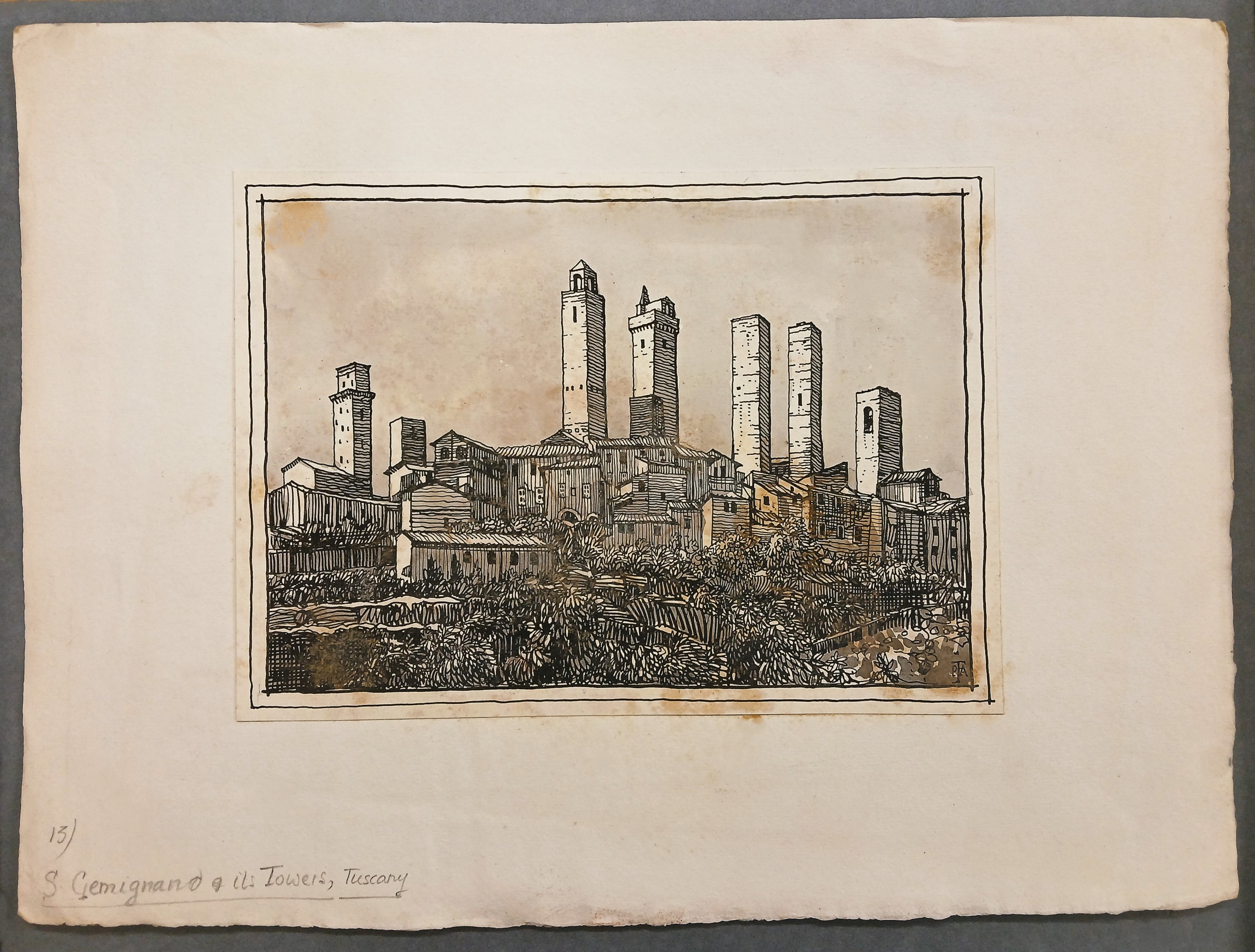 A drawing of the town of San Gimignano in Tuscany, Italy. The illustration shows San Gimignano’s surviving medieval tower houses. The illustration is initialled by Peter Frederick Anson.