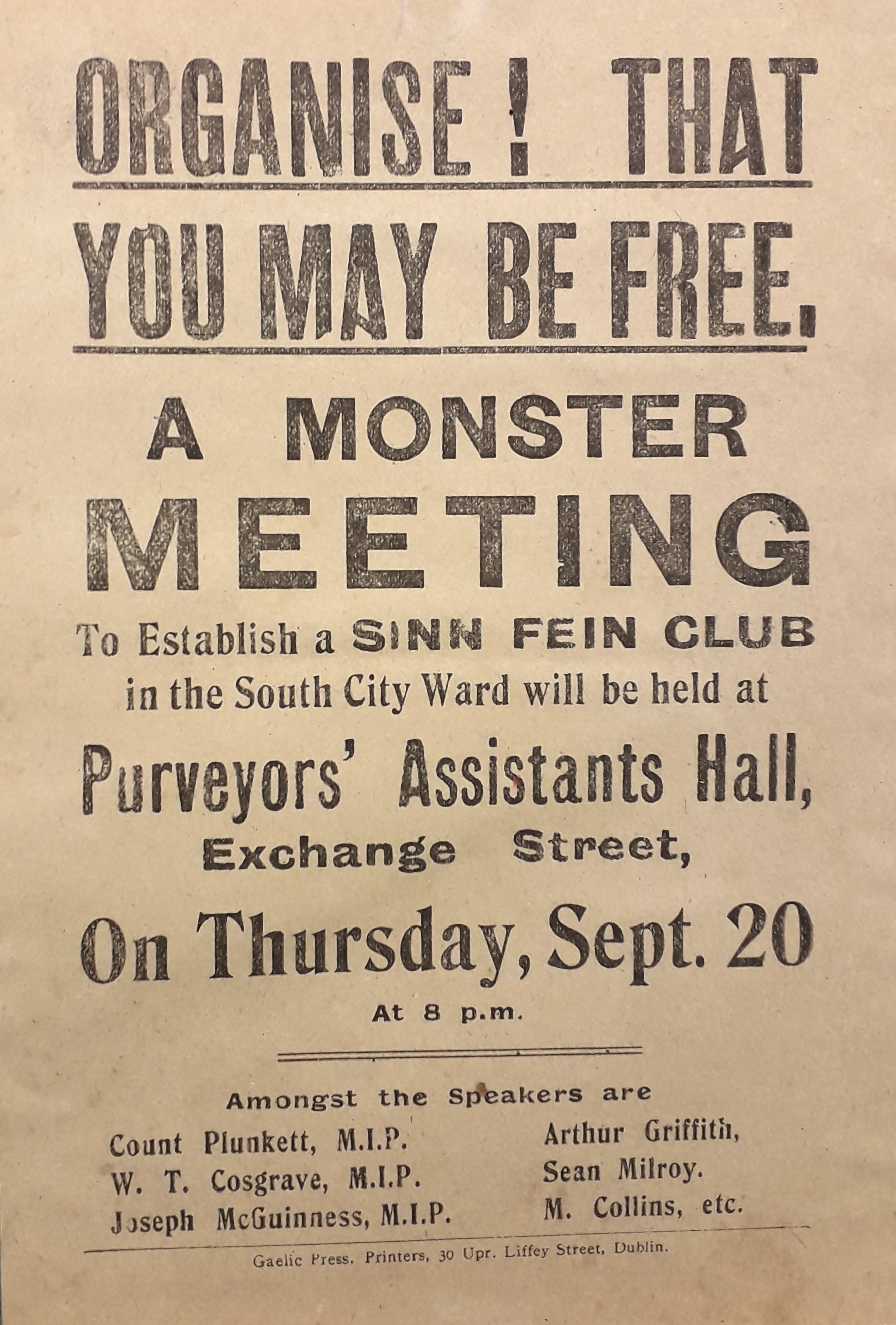 A flier promoting a ‘monster meeting’ to aid in the establishment of a Sinn Féin club. The meeting was to be held in the Purveyors’ Assistants Hall on Exchange Street in Dublin.