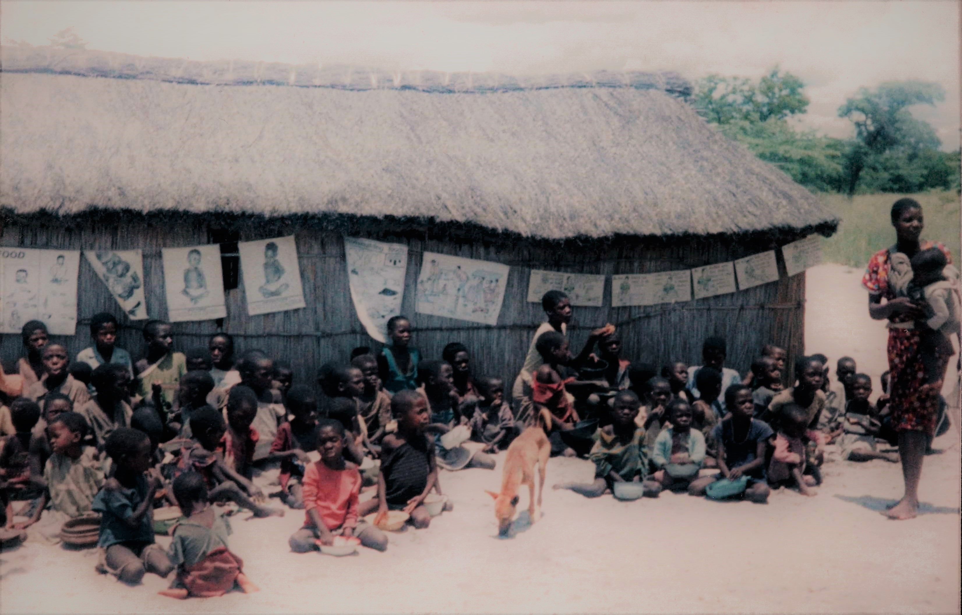 Photographic prints of scenes at an out-station near the Sioma Mission in Zambia. The images show groups of children and parents receiving food and medical care.