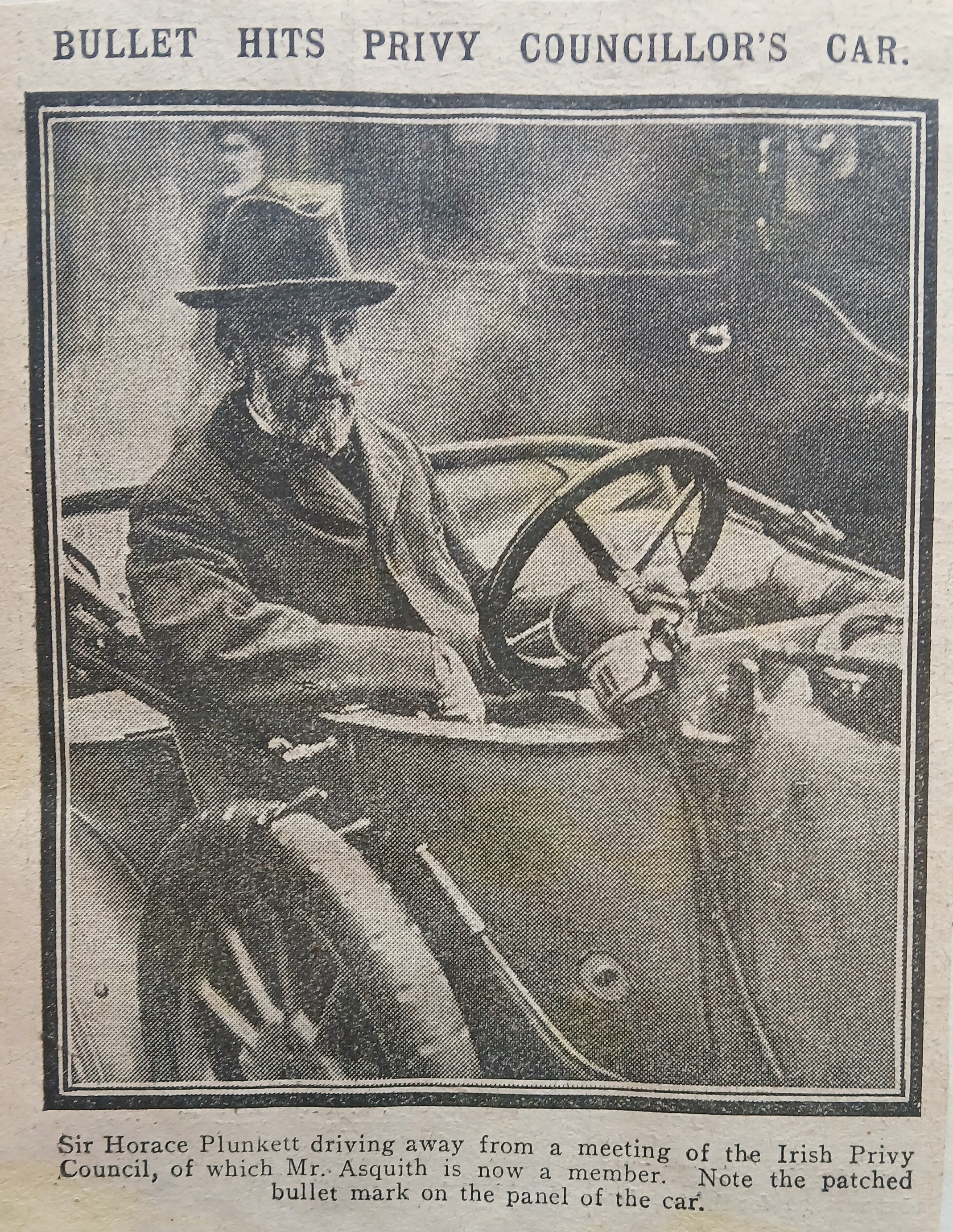 A clipping of a photograph of Sir Horace Plunkett following a meeting of the Irish Privy Council. Reference is made to the bullet hole in Plunkett’s car. The newspaper title from which the clipping was taken is not given.