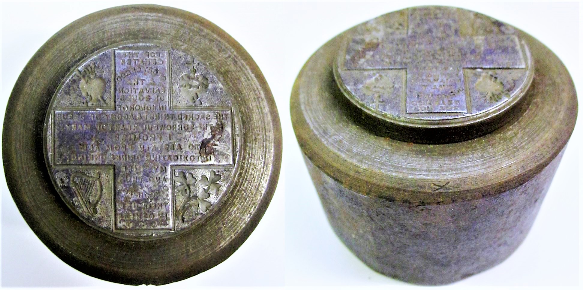 Two metal dies used to strike Total Abstinence Pledge medals. The dies are large metallic pieces that were used to medal a coin, one per each side. The dies have an inverse version of the image to be struck on the medal. One side shows a profile-view of Fr. Theobald Mathew OSFC. The obverse has the cruciform text of pledge. The maker’s stamp on the dies reads ‘G. Cook, 21 Regent Row, Birmingham’.